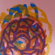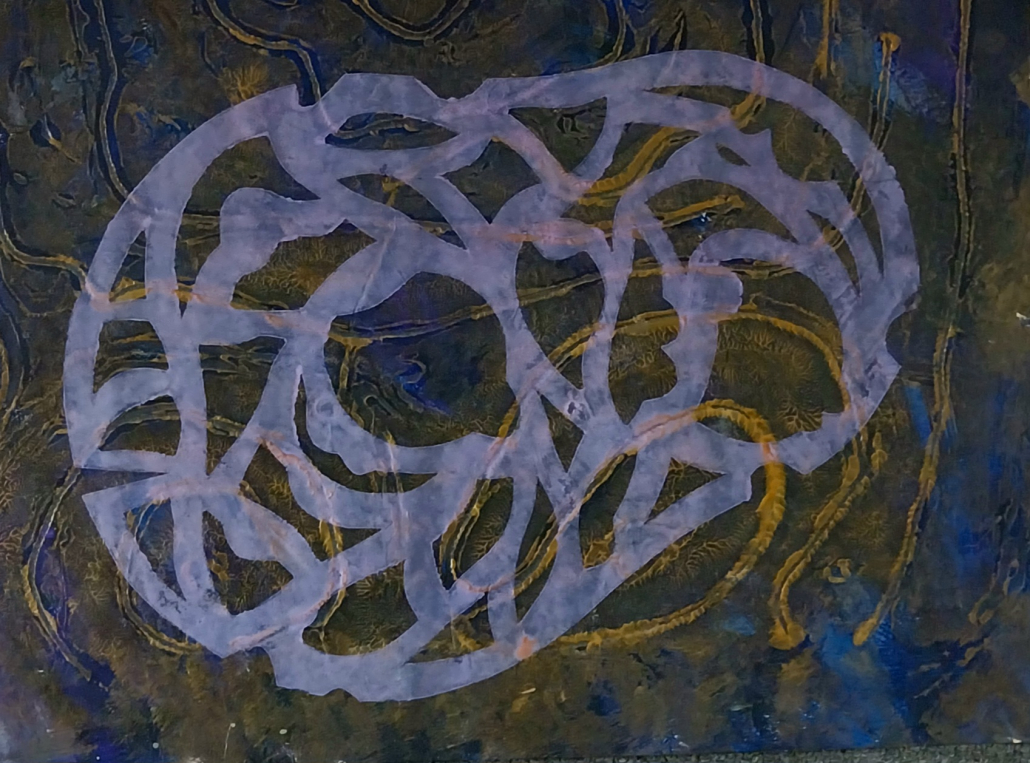 Ghost print over collagraph print on paper