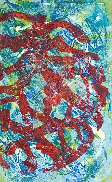 Collagraph print onto monoprint on sugar paper