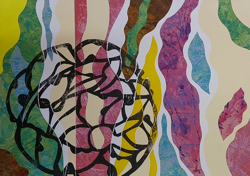 Collagraph print over collage, created with found and monoprinted papers, on board